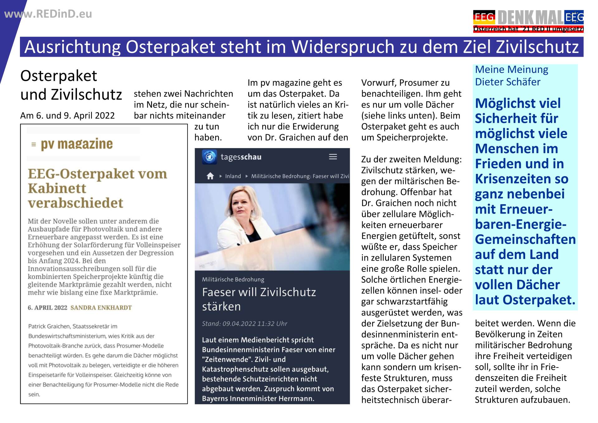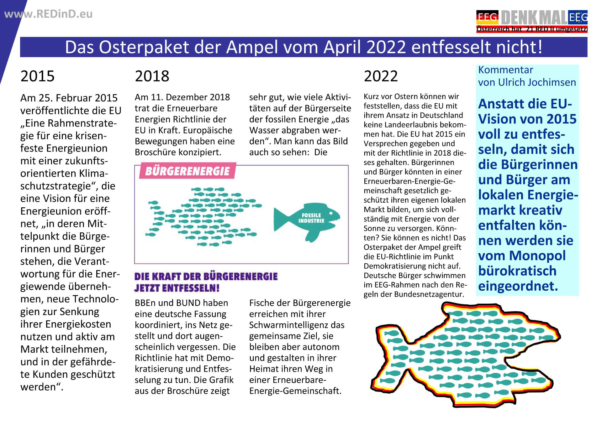 Zum Jahreswechsel 2021/22 hatten wir unsere Arbeit zur Umsetzung der Erneuerbare Energie Richtlinie in Deutsches Recht mit der Seite REDinD.eu neu gestartet. Es war eine ganz neue Lage gegeben, um die Menschen in Deutschland zu überzeugen: Österreich hat die Regelungen umgesetzt und erste Beispiele wurden schon per Video gezeigt. In Deutschland starrte alles auf die neue Ampel-Koalition und dann aufs angekündigte Osterpapier. Jetzt ist es vorgelegt und auf den ersten Blick sieht man, wir sind noch nicht am Ziel. Deshalb in dieser Reihe: Ernüchterndes aus Deutschland, aber auch Hoffnungsschimmer aus Deutschland und vor allem motivierende Beiträge zu der Entwicklung in Österreich.