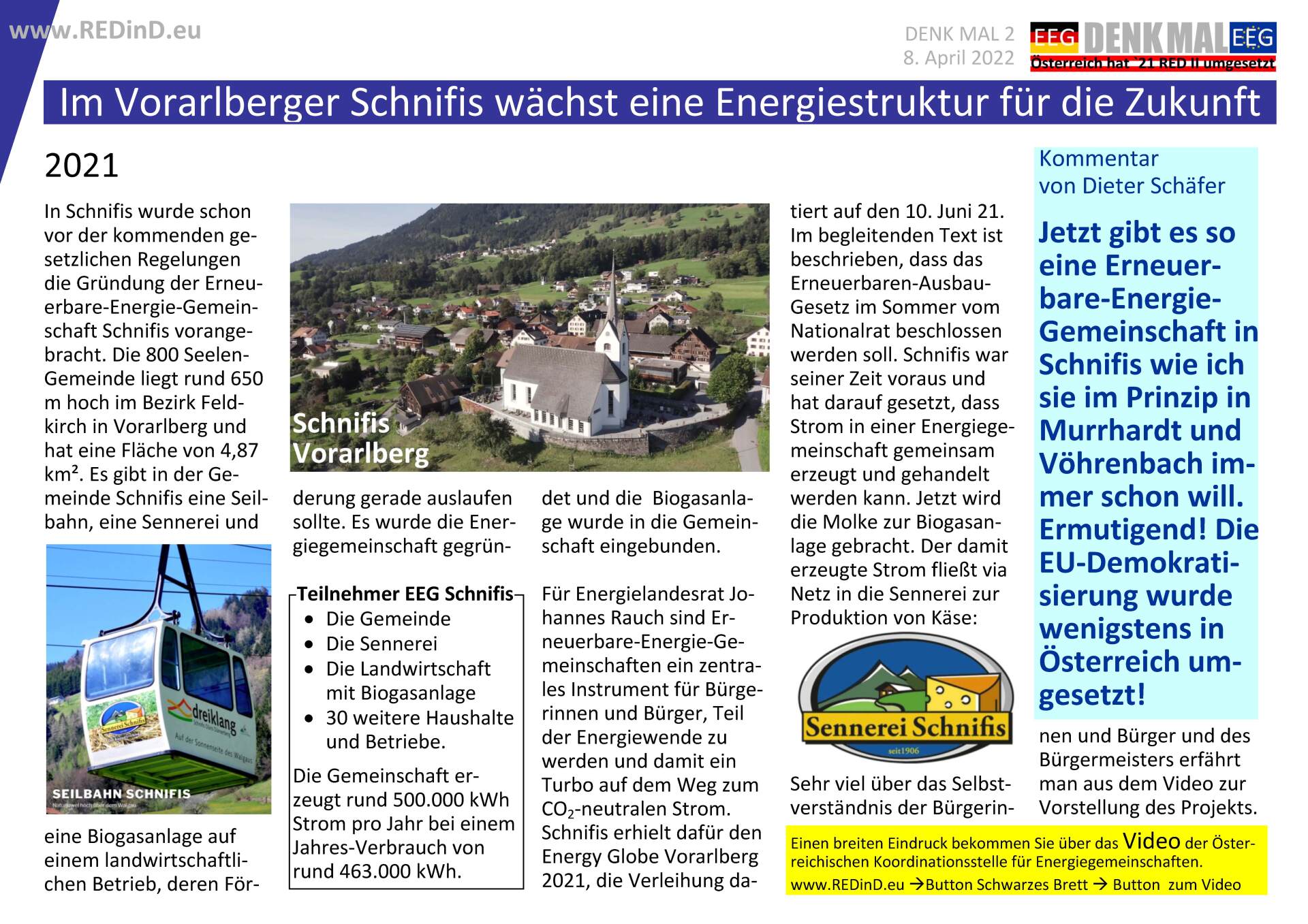 In Schnifis hat man begonnen noch bevor das Gesetz verabschiedet war. Beim Video der ORF betont ein Teilnehmer, dass für ihn der Gemeinschaftsge-danke wichtiger sei wie der finanzielle Aspekt. Wir werden verfolgen, wie sich das Projekt entwickelt.