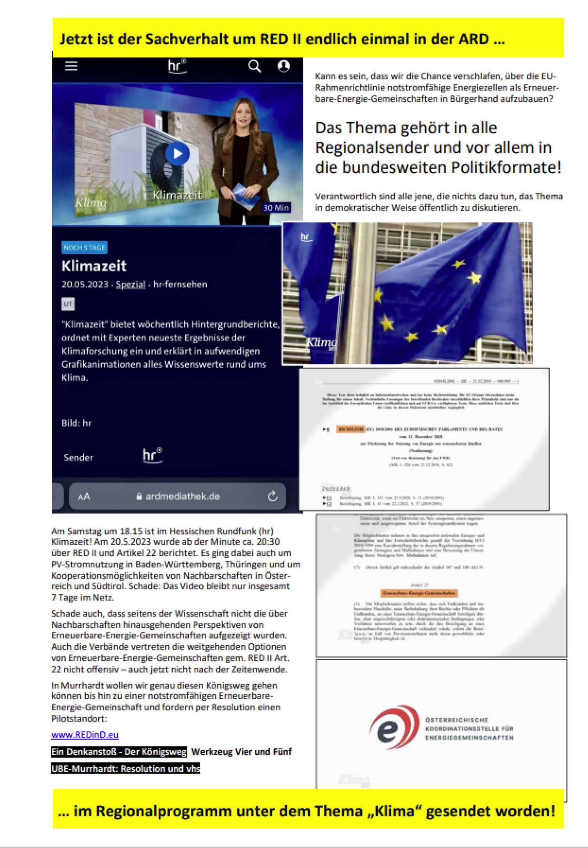 Das Bessere ist der Feind des Guten. Jetzt nehmen wir aber als Blatt zum Einstieg das, was wir haben. Hier soll ein Infoblatt als Einstieg entstehen, mit dem SVEn sich überall vorstellen kann. Die besten Stichworte, die richtigen Gedanken, damit die Leser das Thema aufgreifen und die Zuversicht entwickeln können: Der Einsatz für eine demokratische Energiezukunft lohnt sich! Zum Start zwei Themen: "Echte Bürgerenergie", eingebettet in die "Diskussion um eine Demokratische Energiezukunft" und zwei Anknüpfungspunkte: Deutschlandfunk, Radio-Beitrag - Hintergrund und ein Fernseh-Beitrag von hr/tagesschau 24 - KlimaZeit.