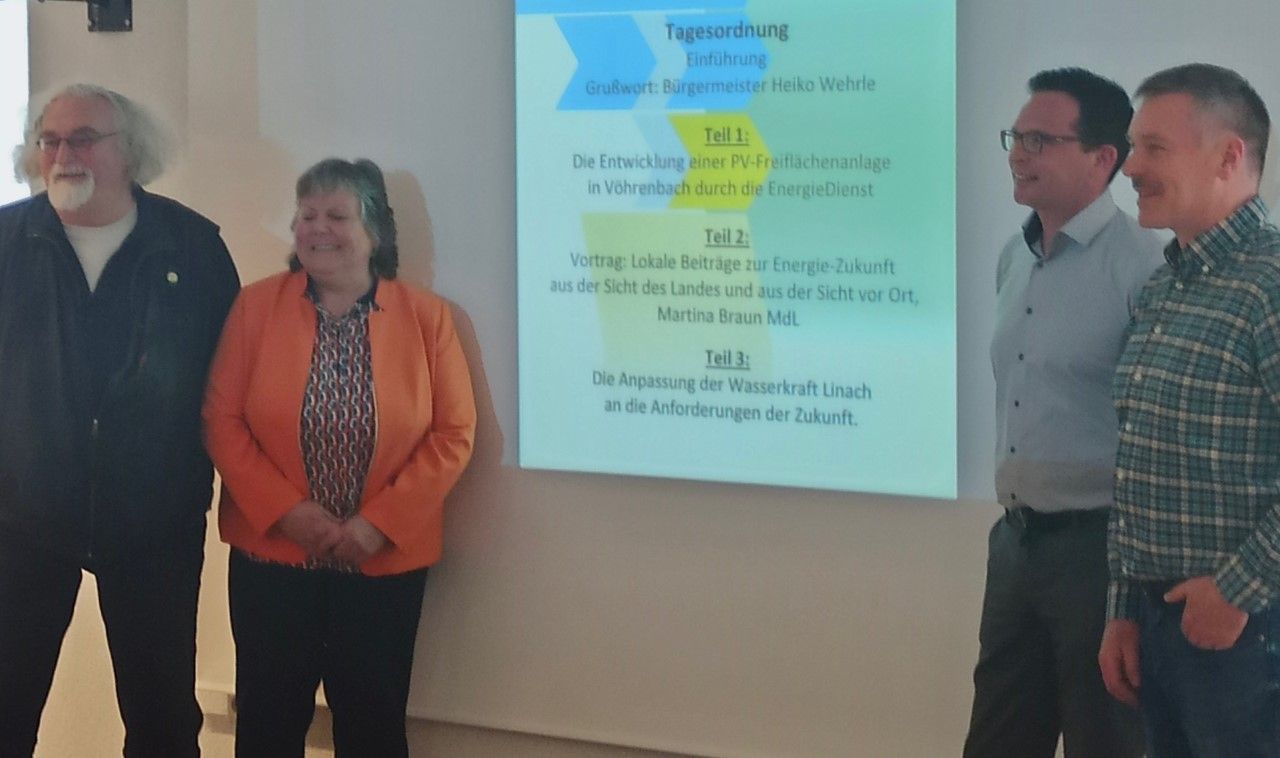 Die Veranstaltung war mit rund 50 Besucherinnen und Besuchern sehr gut besucht. Wir freuen uns, dass wir Bürgermeister Heiko Wehrle (3. von links) für ein Grußwort und Frau Martina Braun (2. von links) für einen Vortrag über landespolitische und lokale Ziele begrüßen konnten. Betriebsleiter Henrik Dezman (ganz rechts) stellte die allgemeinen Grundlagen des PV-Vorhabens der EnergieDienst vor und die Möglichkeiten der Zusammenarbeit. Geschäftsführer Dieter Schäfer ging auf die Nutzung des Stroms aus Vöhrenbach und die Stromlieferung im lokalen Netz ein und erläuterte das Ziel, beim Linachkraftwerk nach der Reaktivierung von Stromerzeugung und Staumauer in einem dritten Schritt die Speicherfunktion reaktivieren zu wollen.
