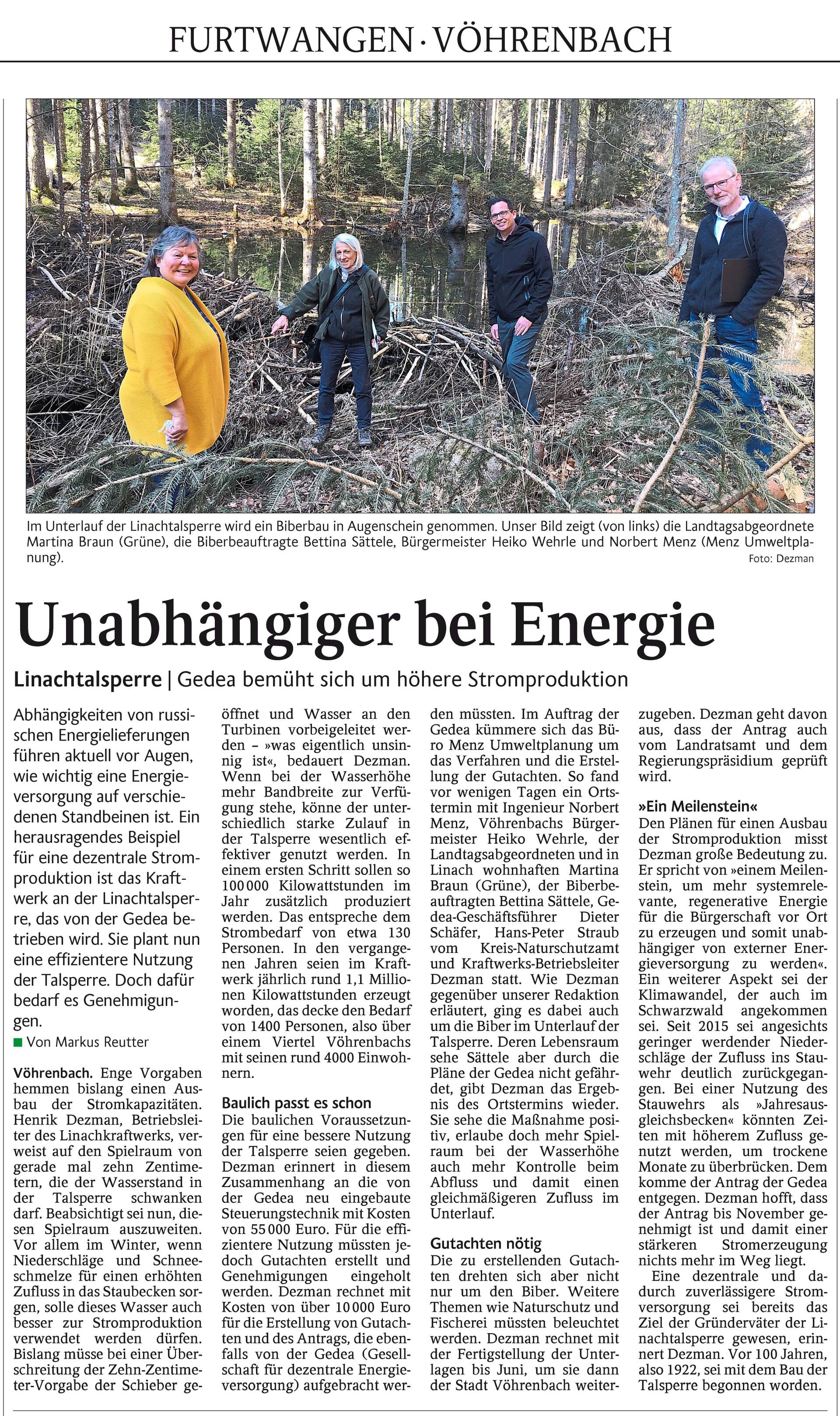 ... und auf Möglichkeit zu Gesprächen über den ersten Schritt zum Konzept der GEDEA-Linach-KG: "Elektrische Energie lokal erzeugen, direkt liefern und vor Ort verbrauchen". Der erste Schritt: Vöhrenbacher