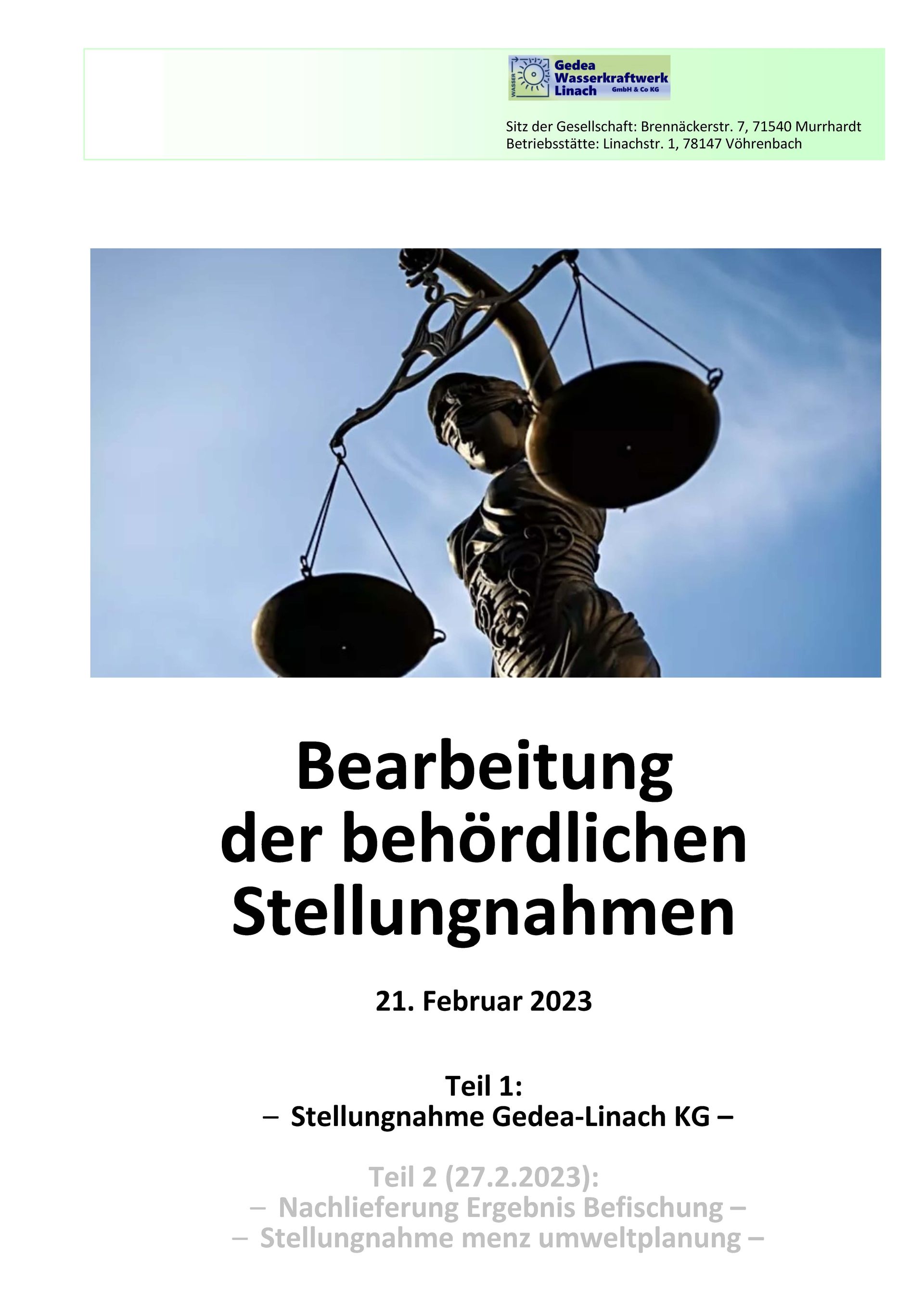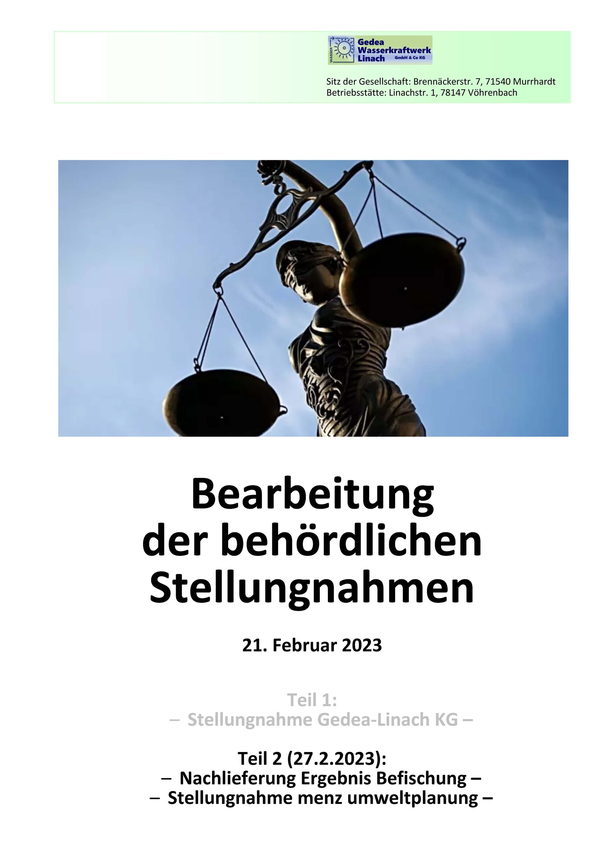 21.02.2023: Nach der webex-Konferenz wurden uns die vier schriftlichen Stellungnahmen zugesendet und wir konnten uns an die Bearbeitung der behördlichen Stellungnahmen machen. Am 21.2.2023 haben wir die Arbeit abgeschlossen und zu einer letzten Anhörung intern verschickt. Neben der Bearbeitung war noch die Nachreichung des Ergebnisses der Befischung zu erledigen und es musste seitens menz umweltplanung auf die aufgeworfenen Fragen der Behörden eingegangen werden. Das haben wir in einem Teil 2 zusammengefasst.