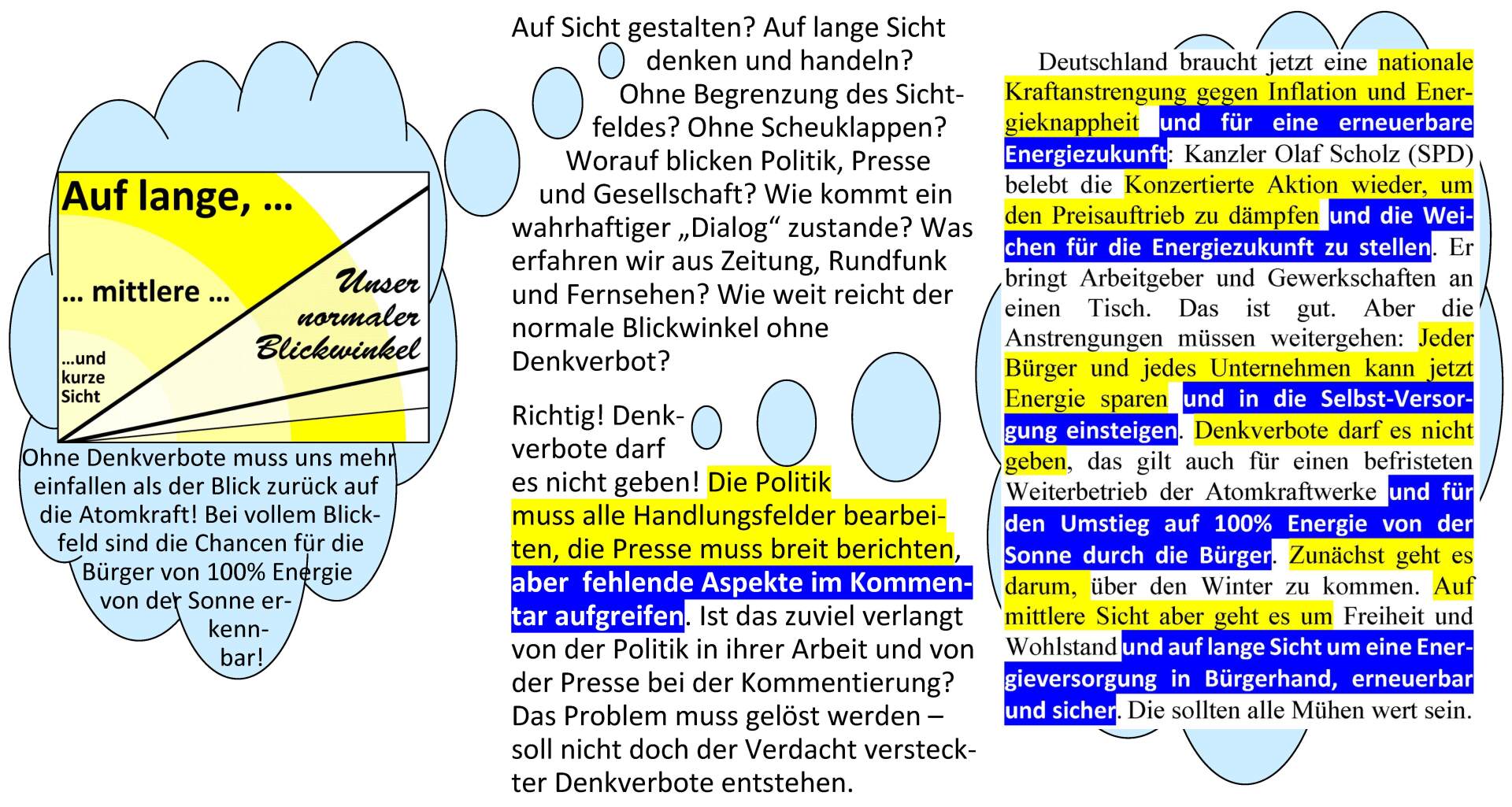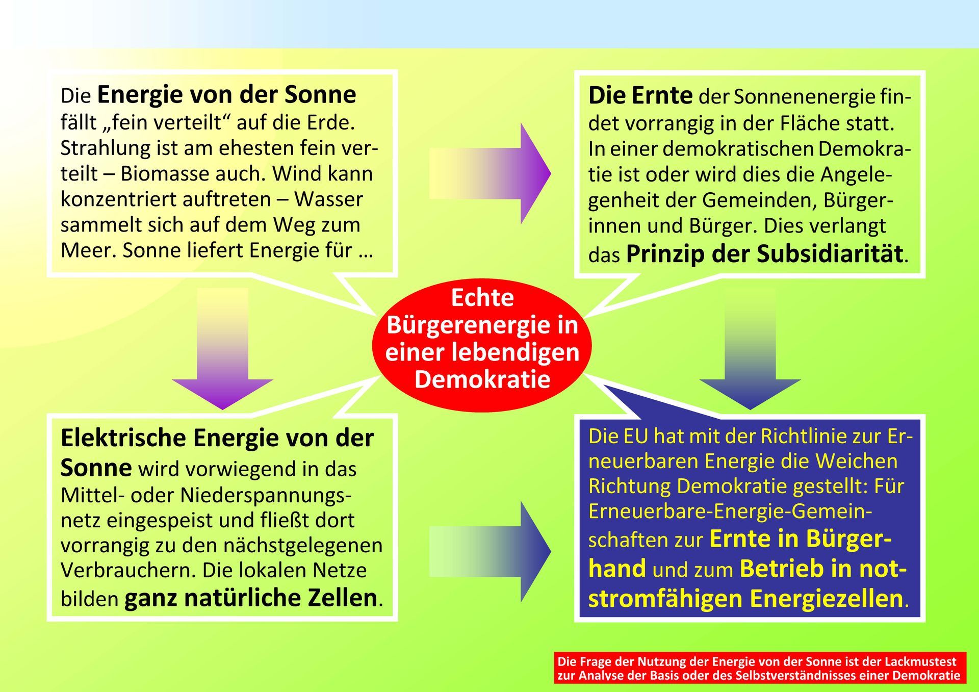 Das Titelblatt und die Wiedergabe des Blattes DENK MAL 4 zeigt die Speerspitze unserer Analyse. Die Politik versäumt die Chance, mit dem Umstieg auf erneuerbare Energien mit den Bürgern eine Energieversorgung zu etablieren, in der die Bürgerinnen und Bürger in guten Zeiten ihre Energieversorgung aus den von der Sonne gespeisten Quellen aufbauen und sich in schlechten Zeiten eine Notversorgung erhalten können.