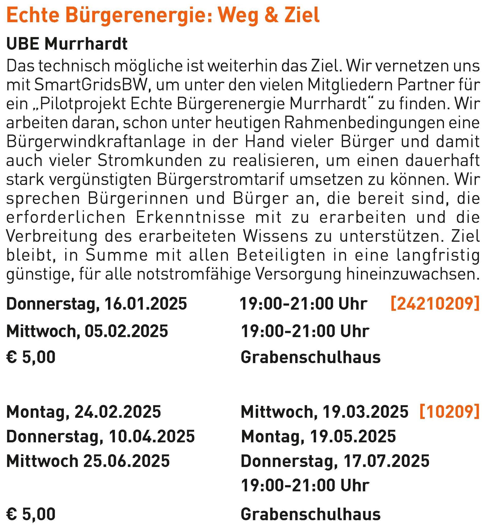Wir wollen eine "Echte Bürgerenergie"! Dazu bieten wir Veranstaltungen an der VHS an. Mehr Infos zu den Veranstaltungen gibt es in unseren beiden Broschüren. Dabei auch der Entwurf für die Erklärung zum Energiepolitischen Dreikönigstag 2024.