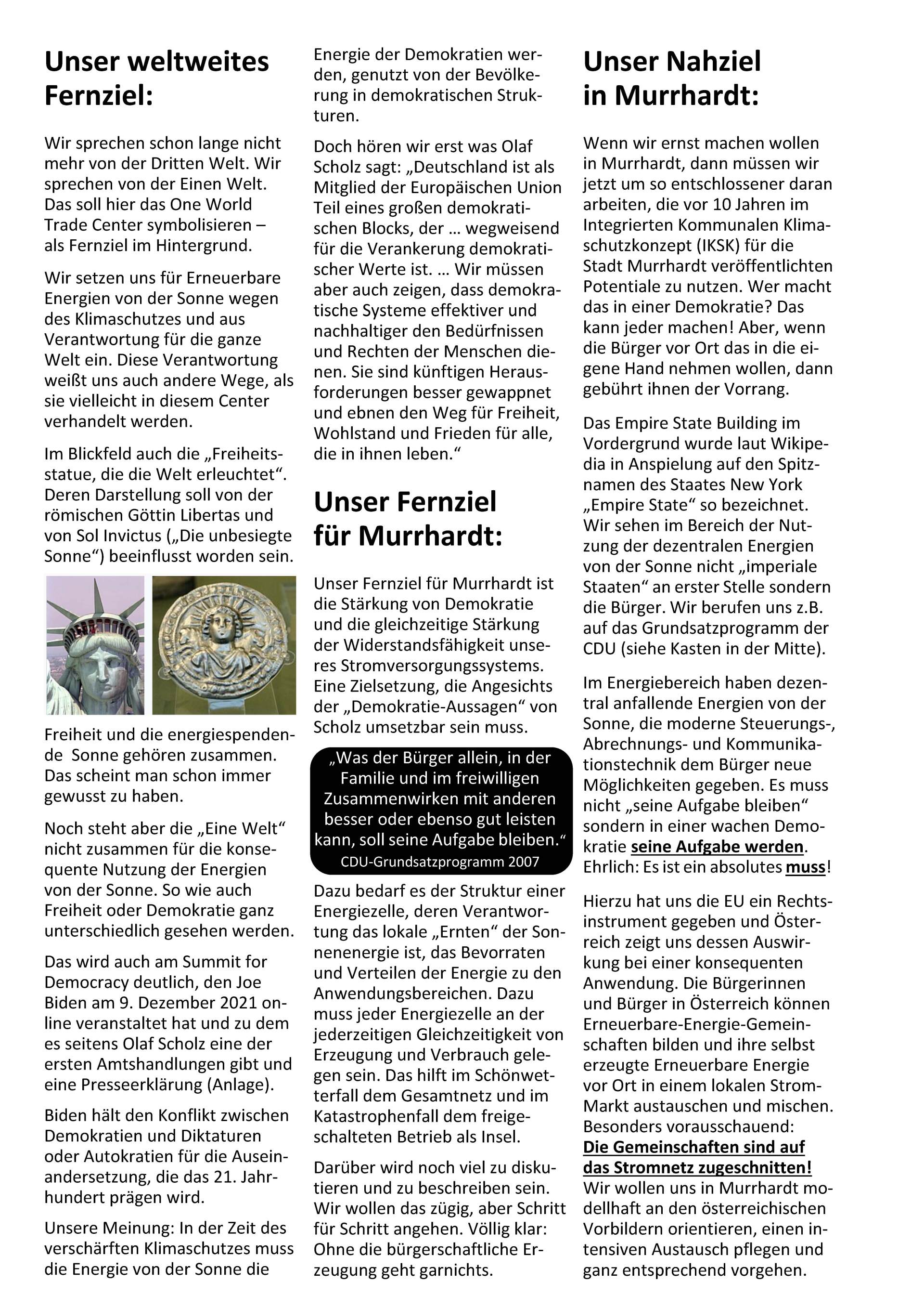Wir wollen schon ganz ehrlich unsere Ziele benennen. Wir haben ein klares Fernziel, daran wollen wir arbeiten. Wieviel leichter würde es uns aber fallen, wenn wir ganz selbstverständlich wie die Bürgerinnen und Bürger in Österreich in die gemeinsame Nutzung der Energien von der Sonne einsteigen könnten. Die Freiheitsstatue, inspiriert von der römischen Göttin der Freiheit und von der unbesiegten Sonne ist dafür ein schönes Symbol.