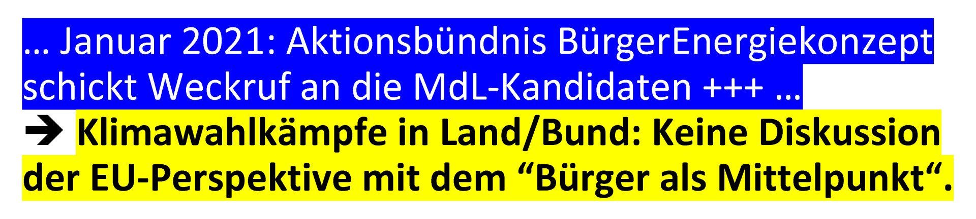 Im Januar 2021 hat das Aktionsbündnis BürgerEnergiekonzept fünf Weckrufe als Denkanstöße an die Politik zur Daseinsvorsorge aus Sicht des Klimawandels den Landtagskandidaten zugestellt.