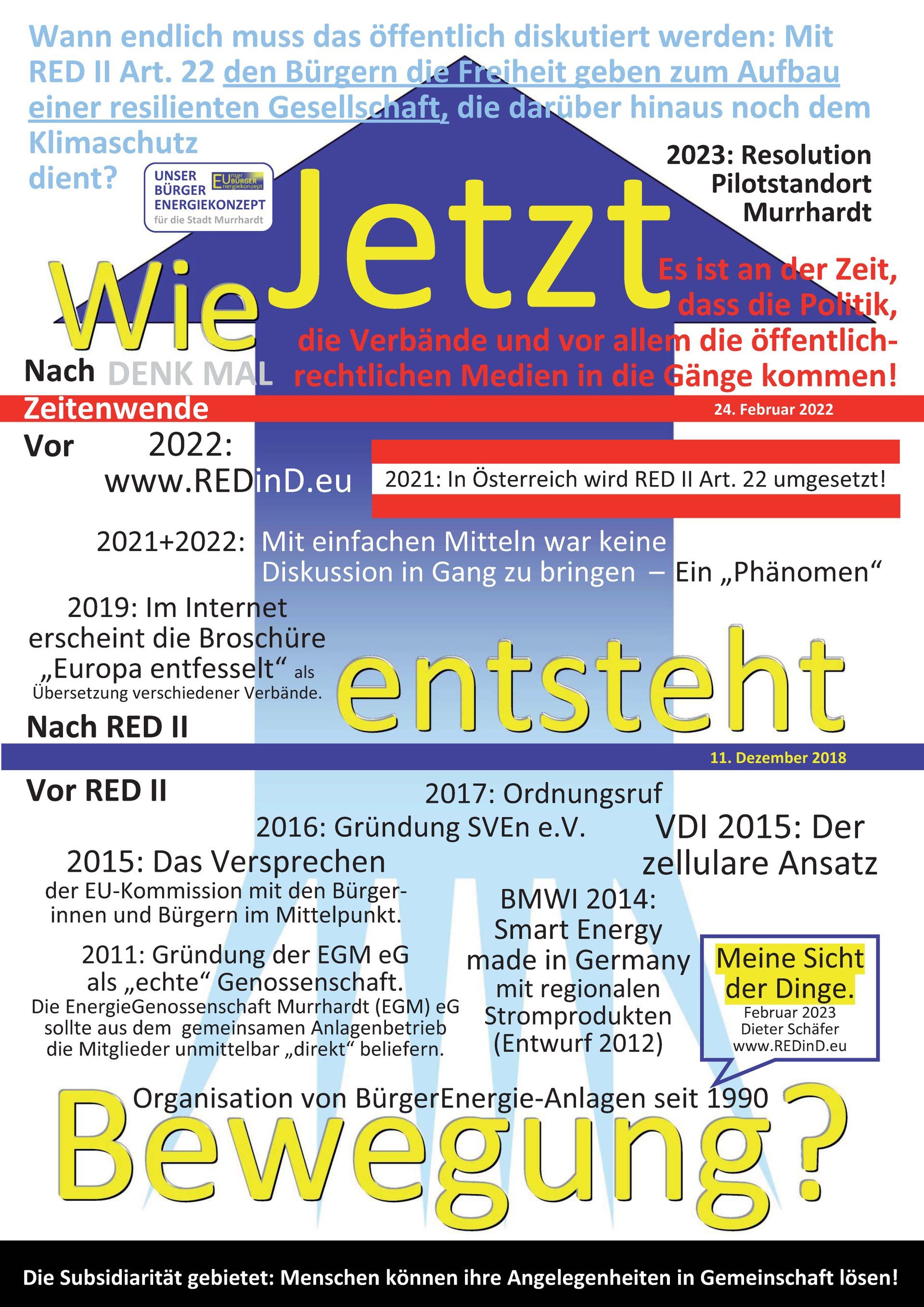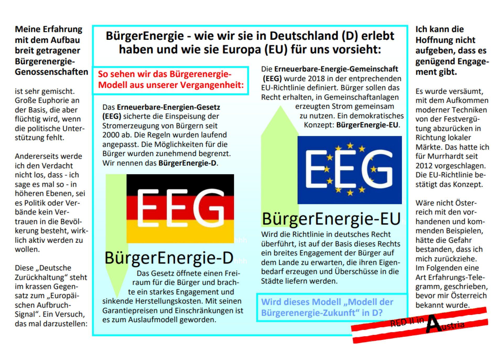Die EU-Richtlinie verfügt tatsächlich über das Potential zu entfesseln. Ich sah die BürgerEnergieZeitenWende kommen. Für die Broschüre begann ich eine Internetseite und sprach verschiedene Organisationen per Offenem Brief an und und und ... . Es war zum davonlaufen. Es wäre zum Davonlaufen - wenn nicht Österreich wäre.