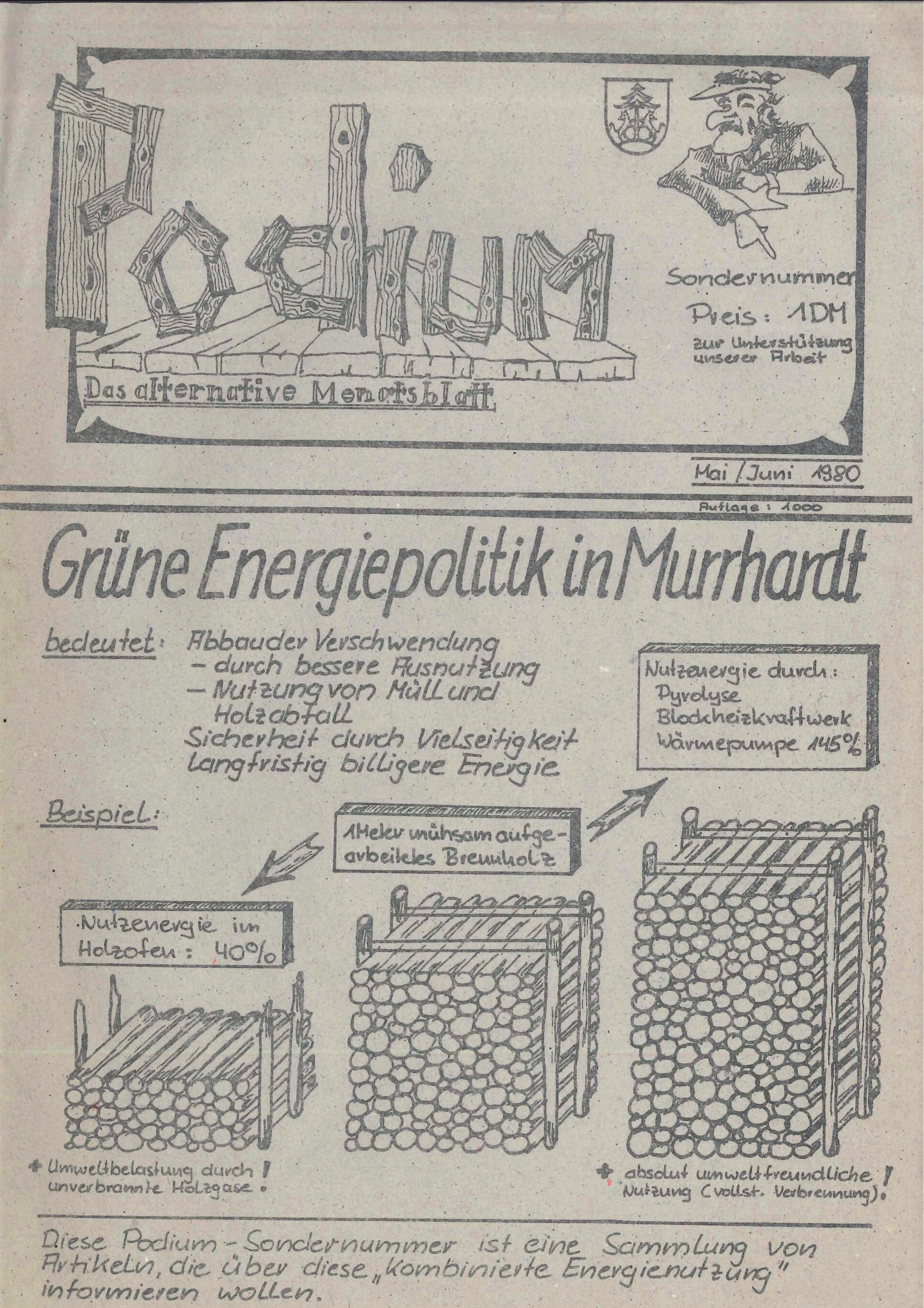 Es ging mit der "Ölkrise" los. in den späten 70er-Jahren lernte ich Kraft-Wärme-Kopplung kennen und trat 1979 den Grünen in Baden-Württemberg bei. Grüne Energiepolitik in Murrhardt, von Hand mit Herzblut geschrieben, in 1980.Über eine Vereinsgründung lernte ich Ulrich Jochimsen aus Flensburg kennen. Bei den Grünen trat ich 1987 aus, weil es nicht zu ertragen war, dass die Energie-Wirtschaft via Tarifänderung das Gründen von Stadtwerken enorm erschwerte und die Grünen auf die Rekommunalisierung setzten, ohne das Problem im Wahlkampf zu artikulieren. Ich habe einen Entschluss gefasst: Ich initiiere Bürgerenergieanlagen.