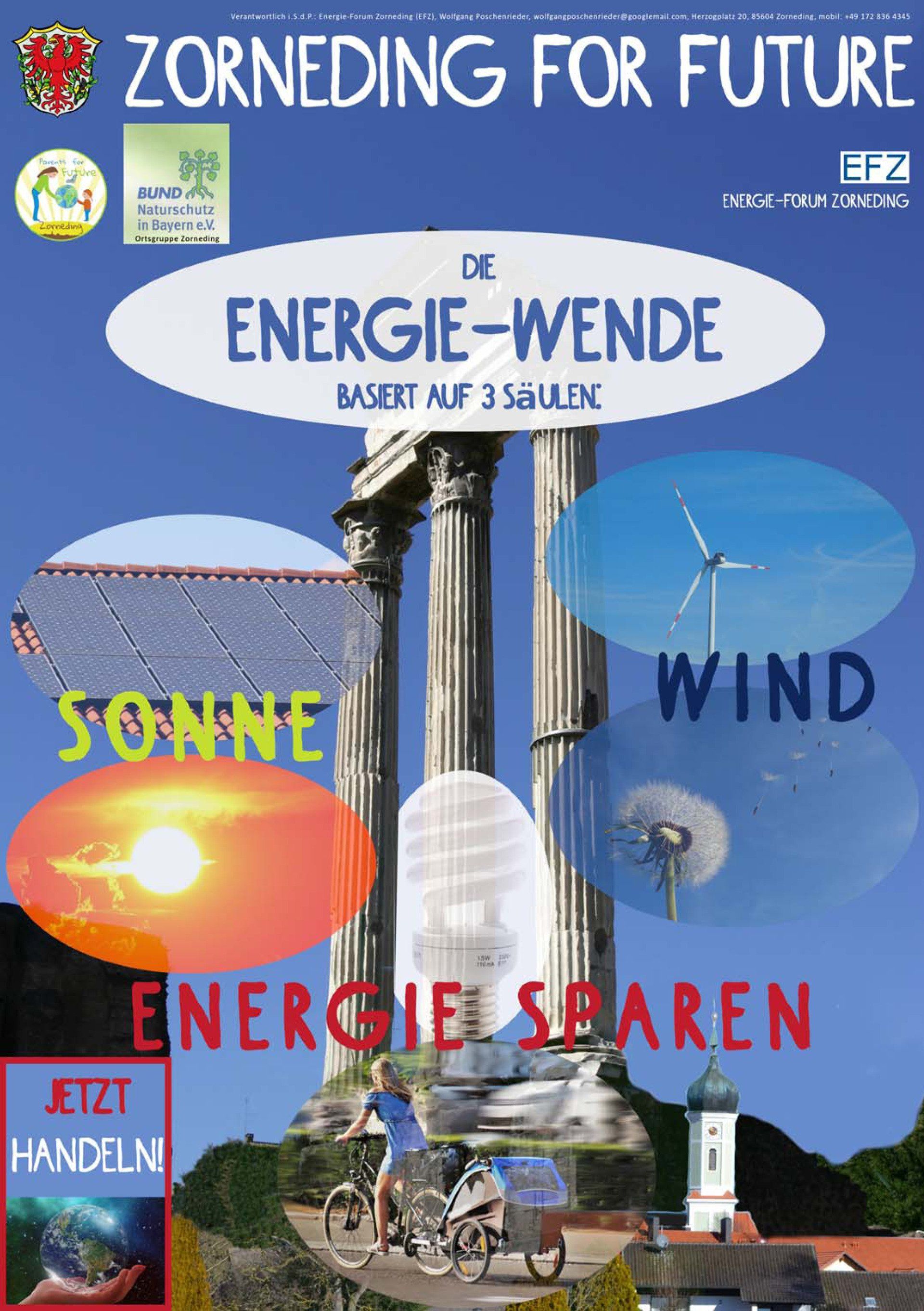 Mit ansprechenden Themen-Plakaten werden den Bürgern die Chancen für die Zukunft aufgezeigt. Das Ziel ist eine Energiewende vor Ort, die auf drei Säulen basiert. Ein auf Sparsamkeit optimiertes System wird mit den heimischen Energien aus der Sonne und dem Wind versorgt. Dafür wollen die Initiatoren möglichst viele Bürger