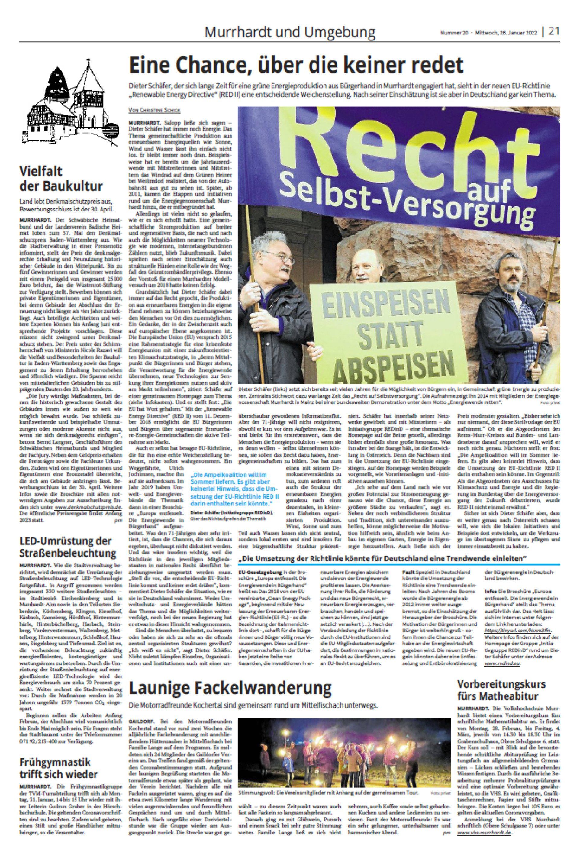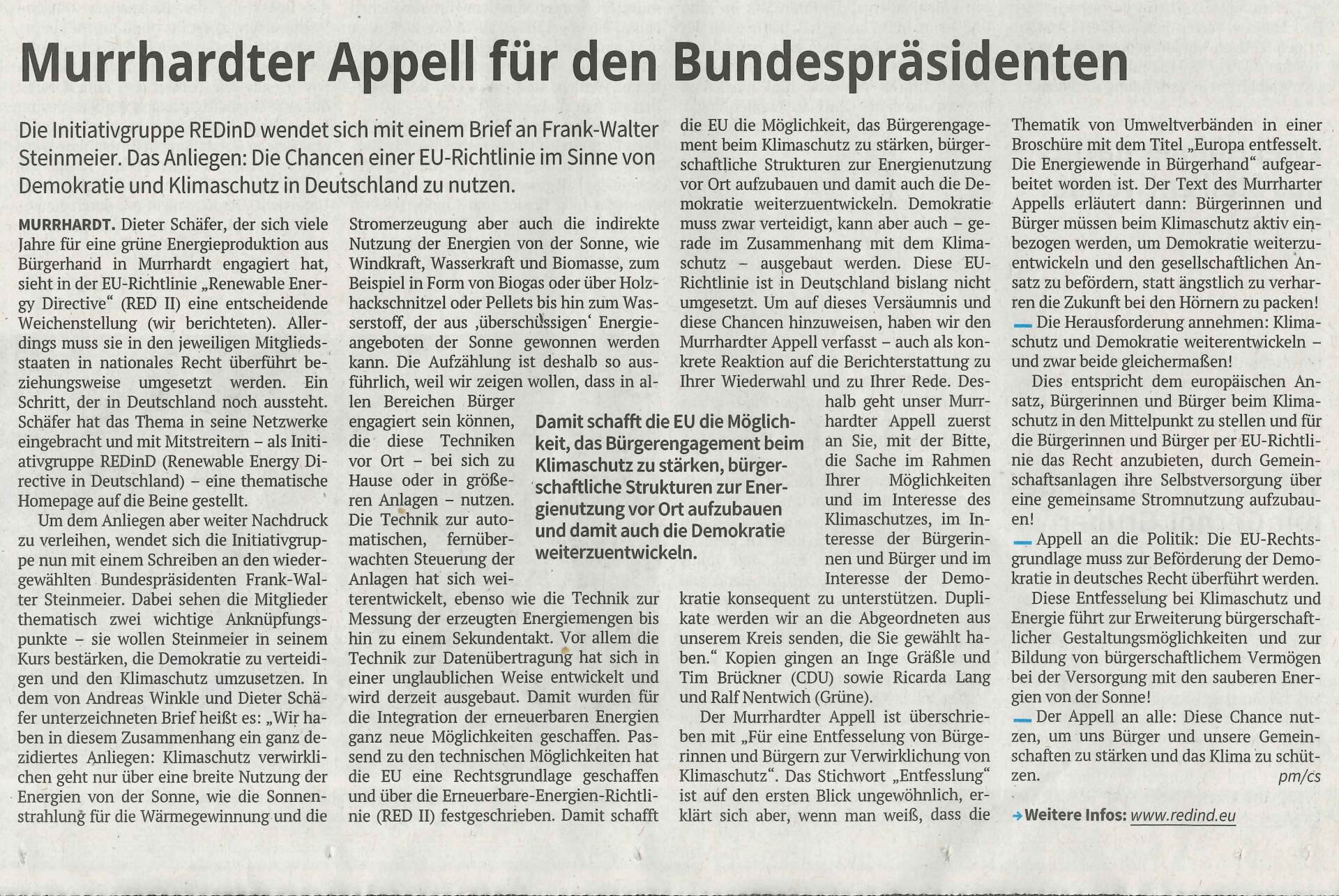 Der "Murrhardter Appell" ist inspiriert von den Tatsachen, dass RED II in Deutschland in den entscheidenden Bereichen für die Demokratisierung nicht umgesetzt ist und von der Rede und Berichterstattung über die Wahl des Bundespräsidenten, der die Demokratie verteidigen und den Schutz des Klimas voran bringen will. Daher der Brief an den Bundespräsidenten.