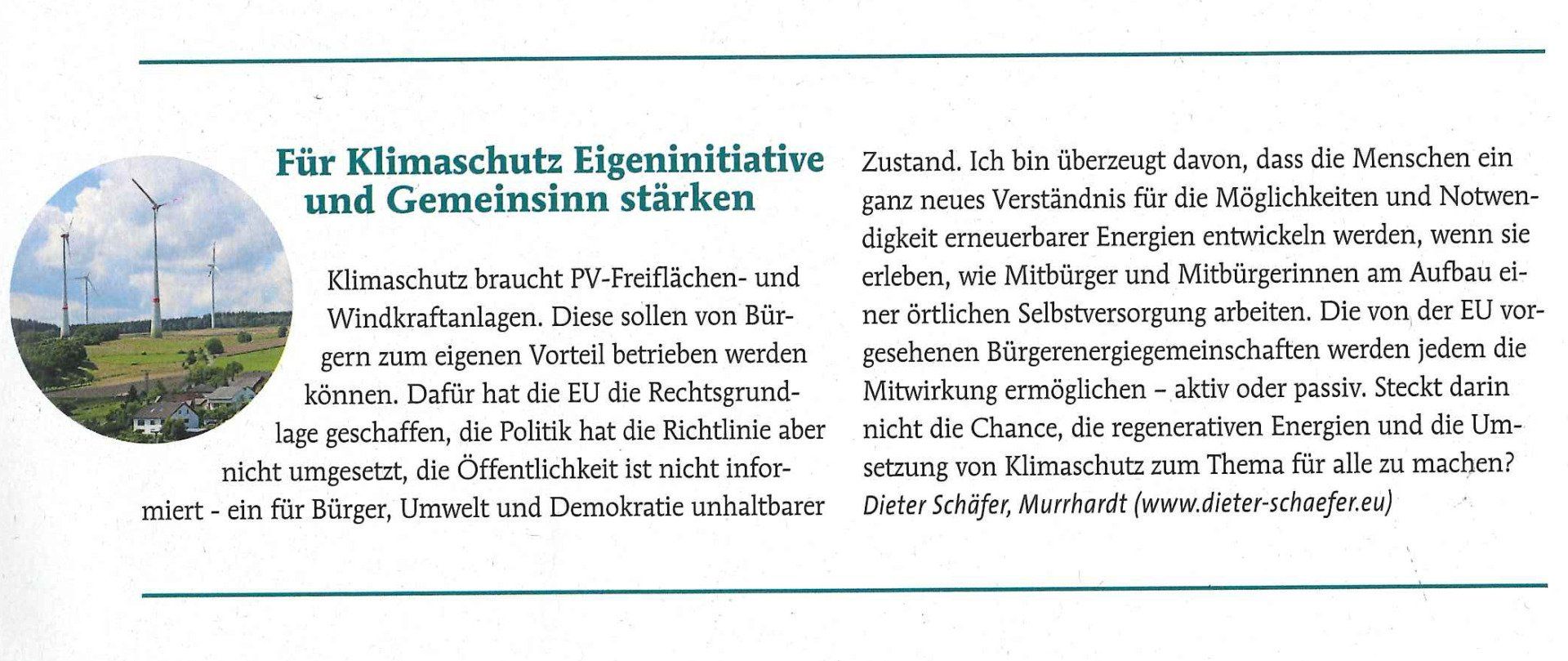 Die Weichenstellung der EU aufgreifen ist mehr als Klimaschutz intensivieren durch mehr Anlagen mit kürzeren Genehmigungszeiten und der Möglichkeit einer Bürgerbeteiligung. Die EU hat die Bürgerinnen und Bürger in den Mittelpunkt gestellt, die Verantwortung übernehmen, neue Technologien nutzen und aktiv am Markt teilnehmen. Um derart weitgreifende Schritte gehen oder gar große Sprünge machen zu können, brauchen die Bürgerinnen und Bürger die volle Beinfreiheit und auch die Zeit, um Anlauf nehmen zu können. Die Bürgerinnen und Bürger brauchen mutige Politiker im Bund aber auch in Europa und in den Ländern, die diese Ziele und Regelungen der EU klar aussprechen und sich ohne "wenn" und "aber" für deren Umsetzung einsetzen.